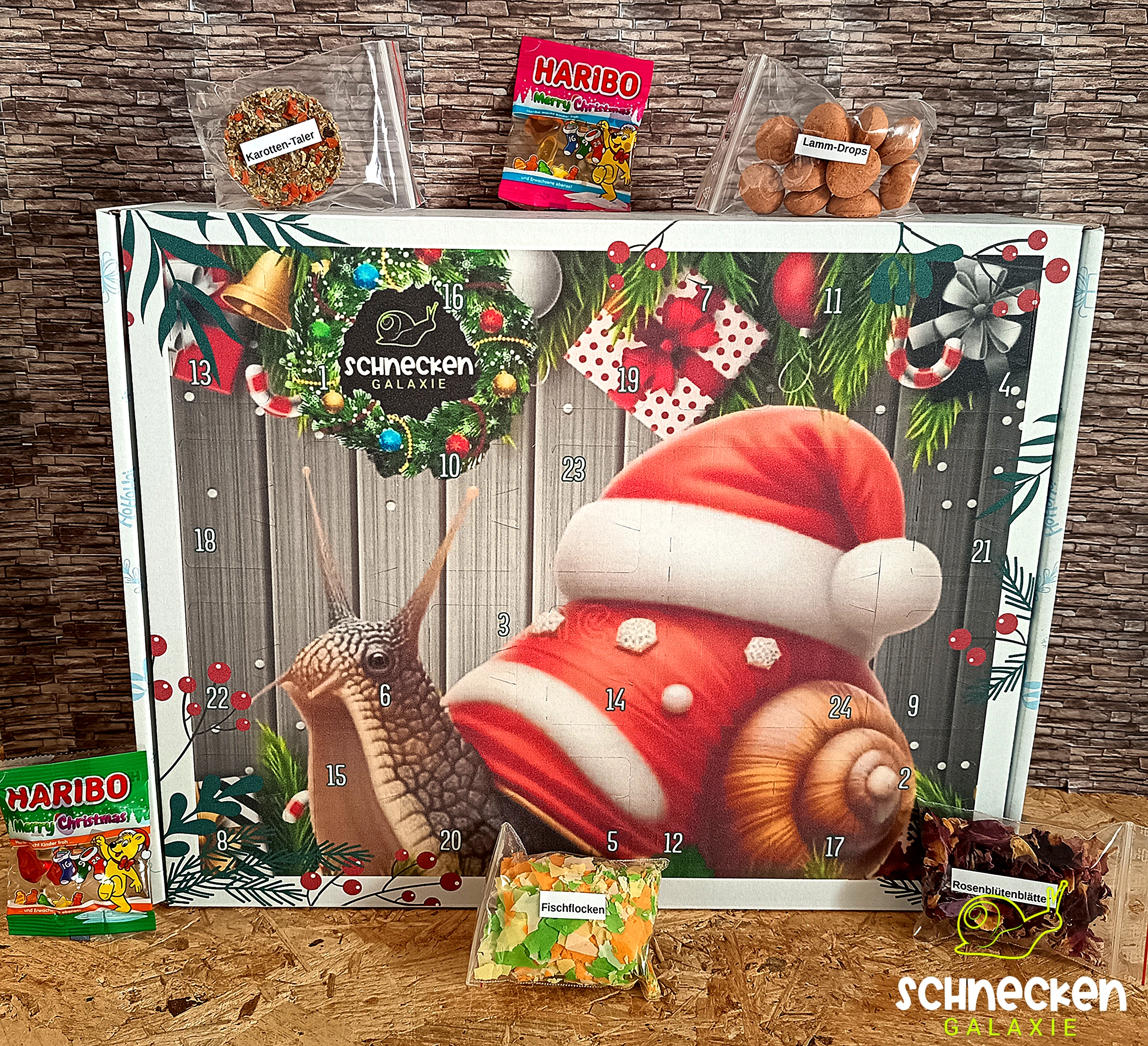 Wie wäre es dieses Jahr mit einem Adventskalender für Euch und eure Schnecken? Dann ist dieser Kalender genau das richtige für euch. Der Kalender wurde in liebevoller Handarbeit von uns befüllt. Es erwartet euch jeden Tag ein anderer leckerer Snack für eure Schleimer, sowie auch für euch eine kleine Süßigkeit.