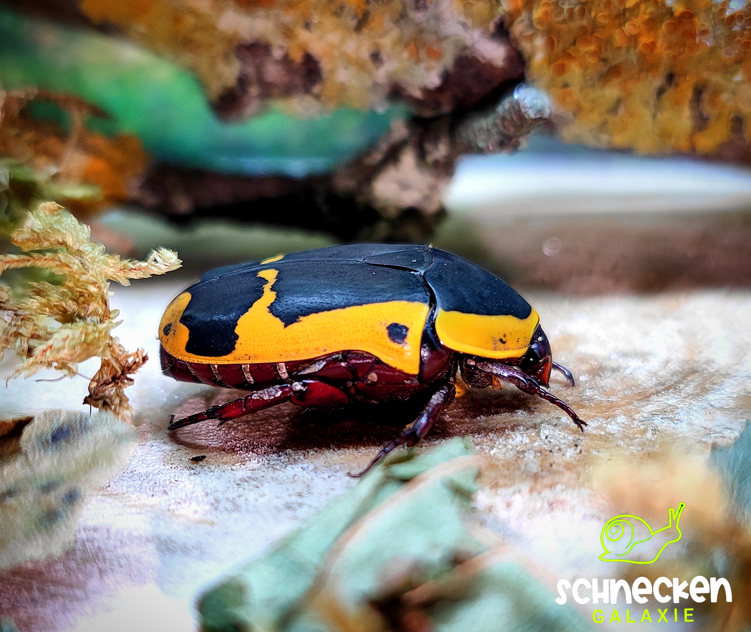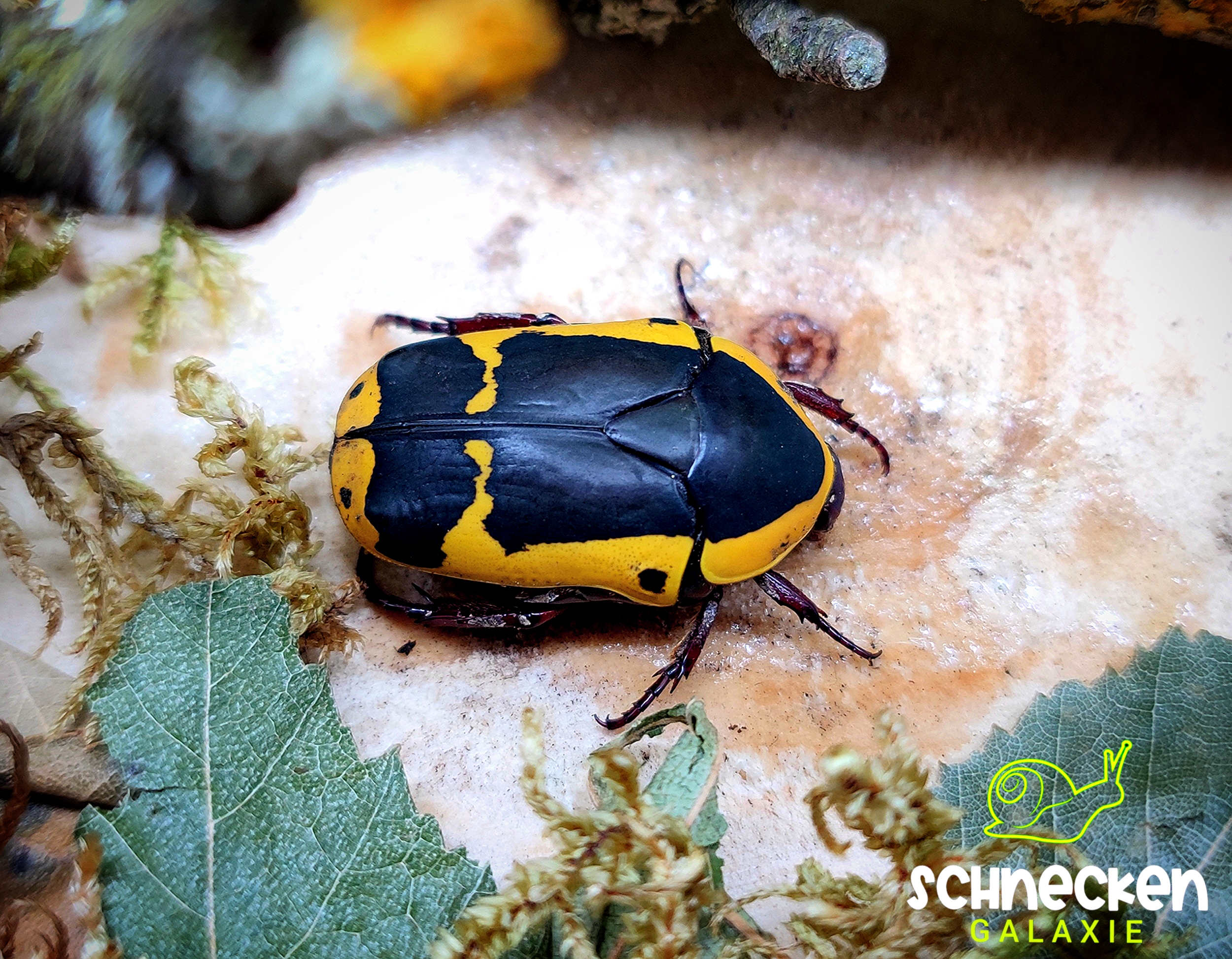 Der Südafrikanische Fruchtkäfer ist eine leicht zuhaltende Käferart. Er hat eine gelb- schwarze Rückenfärbung und ist daher sehr auffällig. An den Körperseiten ist er rotbraun mit weißen Flecken. Als Bodengrund sollte am besten Wald oder Gartenerde verwendet werden, diese sollte immer feucht sein. Damit die Käfer sich in die Erde eingraben können, sollte die Erde mindestens 10 cm hoch sein. Außerdem sollte immer genügend weißfaules Holz und Futterlaub im Terrarium vorhanden sein. Da sie gern klettern kann man zusätzlich noch Äste in das Terrarium geben, damit sie daran klettern können. Gefüttert werden sollten sie mit reifen Obst wie zum Beispiel Banane oder Apfel.