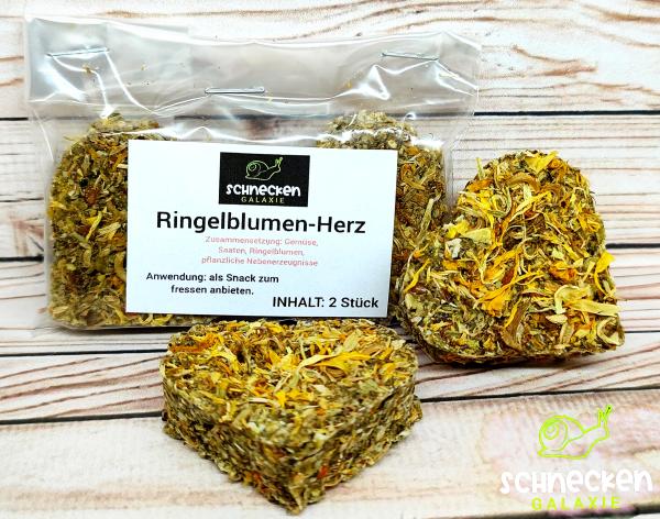 Die Ringelblumen- Herzen bestehen aus Gemüse, Saaten und Ringelblumen. Es ist der perfekte Snack für eure Achatschnecken. Die Herzen lassen sich ganz einfach zerteilen so das es auch für kleinere Schneckenarten geeignet ist