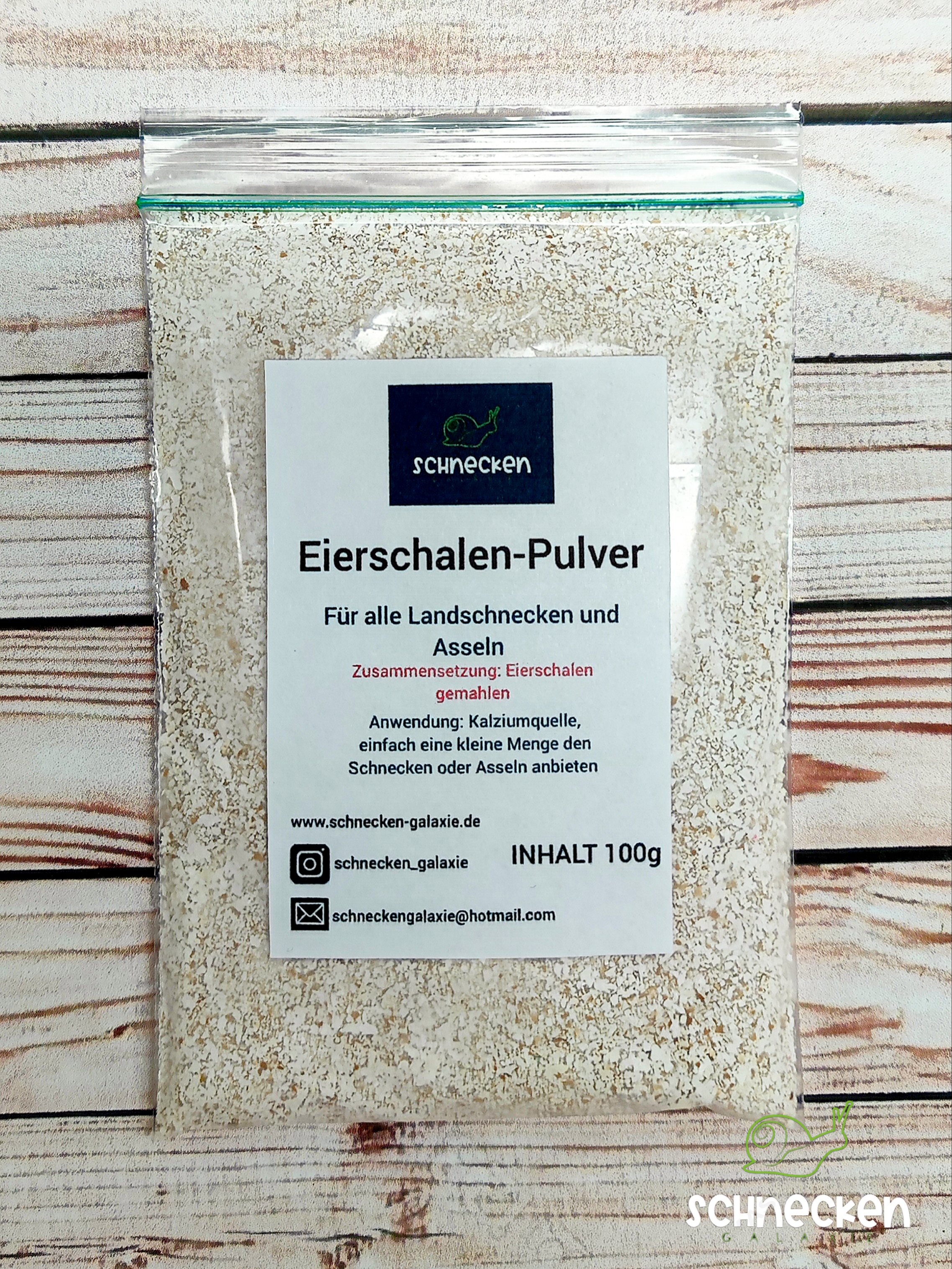 Hier erhaltet Ihr 100g gemahlene Eierschalen, die sehr gern gefressen werden. Für Schnecken ist es wichtig verschiedene Calciumquellen anzubieten, damit Ihr Haus gut wächst. Auch Asseln fressen das Eierschalen-Pulver sehr gern, dazu einfach eine kleine Menge auf den Boden streuen.