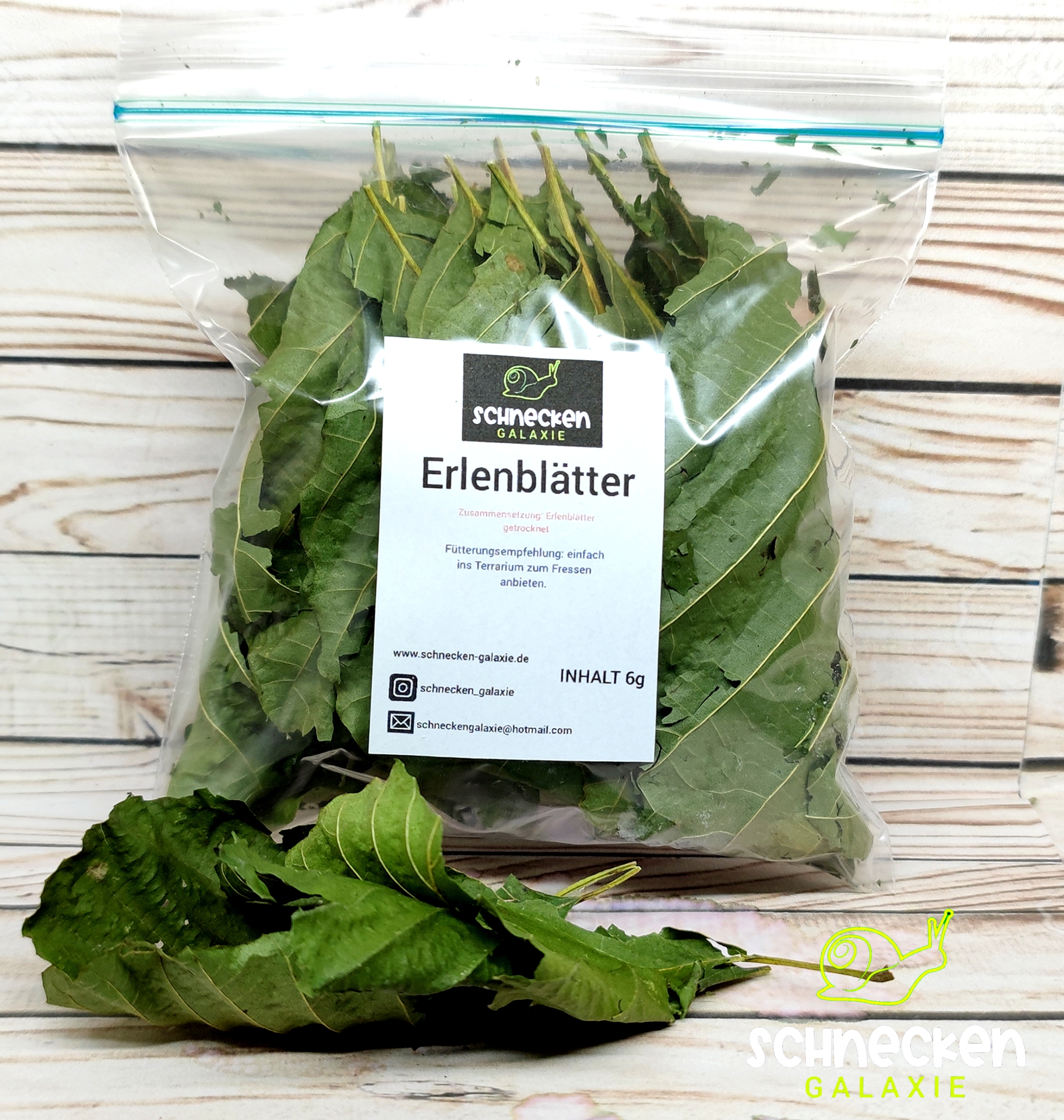 Erlenblätter sind ein leckerer und abwechslungsreicher Snack. Es ist auch gut geeignet für kranke Schnecken, da Erle das Immunsystem stärkt und Giftstoffe aus dem Körper transportiert.